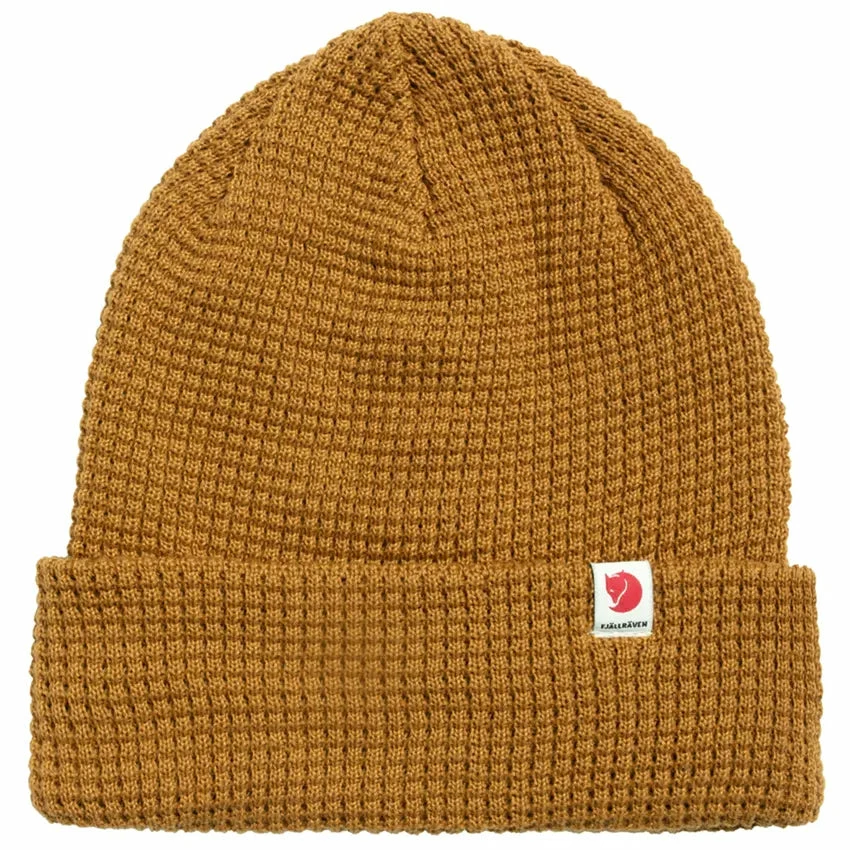 A soft, comfortable knitted hat from Fjällräven made from 100% recycled polyester. With a decorative waffle-knit and wide fold-up edge – the material of the Tab Hat wicks away moisture and dries fast, so it works well for both everyday life and when out on the hills. Small Fjällräven logo tab on the folded edge.