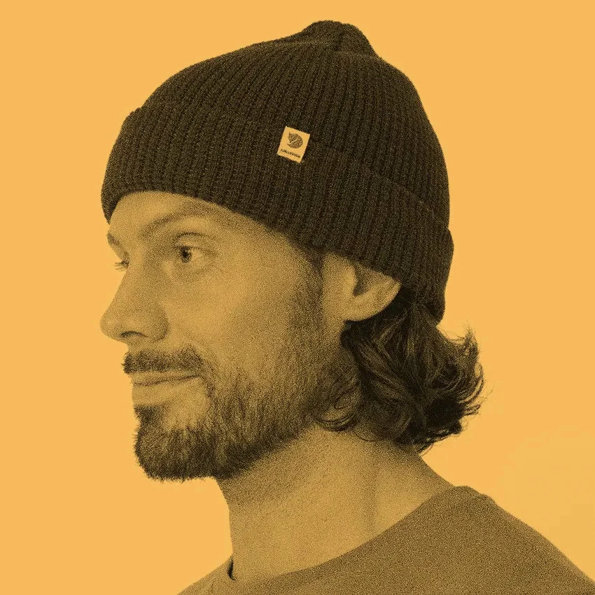 A soft, comfortable knitted hat from Fjällräven made from 100% recycled polyester. With a decorative waffle-knit and wide fold-up edge – the material of the Tab Hat wicks away moisture and dries fast, so it works well for both everyday life and when out on the hills. Small Fjällräven logo tab on the folded edge.