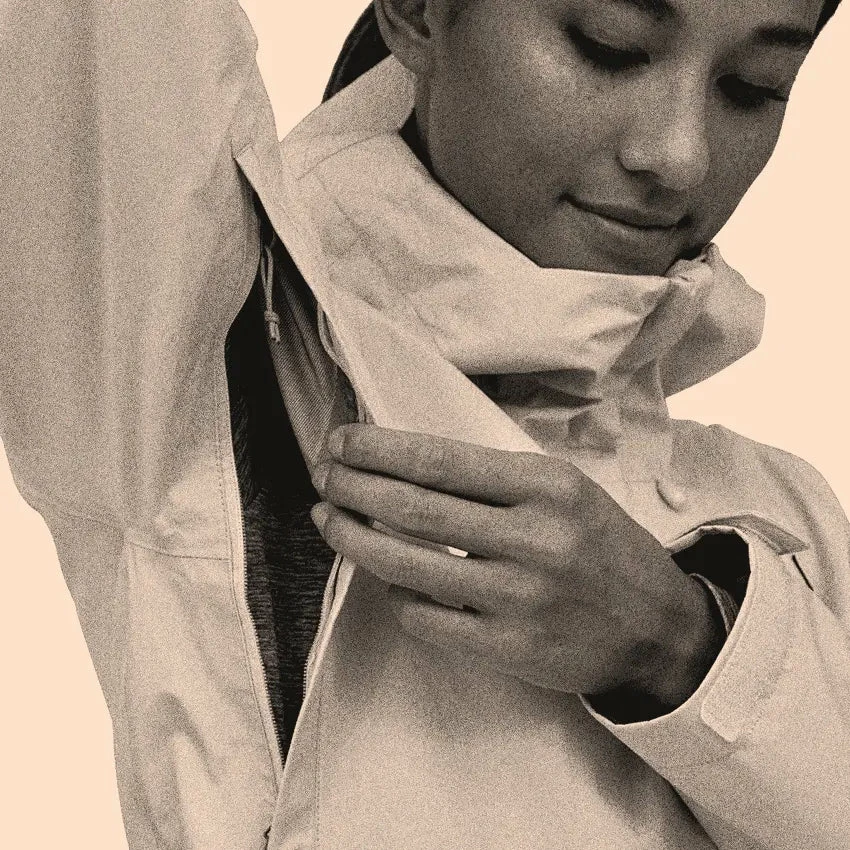 Two handwarmer pockets and venting pit zips with welted exterior storm flaps allow you to quickly ventilate the jacket when active. The Jacket also self-stuffs into its left handwarmer pocket with carabiner clip-in loop so you can have it with you at all times.