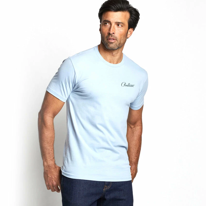 A super soft, combed cotton t-shirt from Pendleton with a vintage-inspired scene of Glacier National Park on the back and small Pendleton logo on the front left chest. Supreme quality and timeless style.